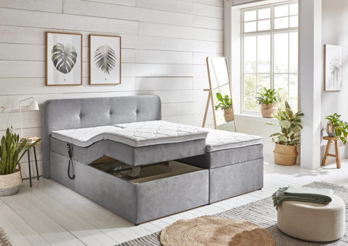 Das Boxbett Gabriola der Firma Sun Garden hat eine 7-Zonen-Taschenfederkernmatratze und ist motorisch verstellbar. Unter dem Kopf- und dem Fußteil befindet sich ein Bettkasten und bietet viel Stauraum.