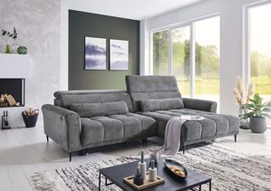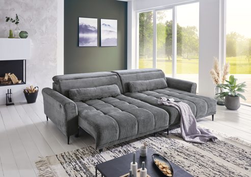 Das Ecksofa Logan der Firma Iwaniccy ist im angesagten Cord-Stoff in der Farbe dunkelgrau gehalten.. Das Highlight ist die XL elektrisch verstellbare Sitzfläche, die zu einer bequemen Position wird, um die Beine hochzulegen.