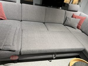 Hier haben Sie viel Platz für Ihre Gäste, denn die Garnitur verfügt neben den vielen Sitzmöglichkeiten auch noch über eine Schlaffunktion und Stauraum über die komplette links Seite. Außerdem kann man es sich auf dem Canape super bequem machen und durch einen Motor die Liegelänge einstellen.