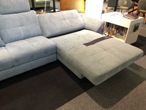 Die Wohnlandschaft Viva der Firma Carina ist in einem freundlichen blau/grün gehalten. Sie besitzt eine Bettfunktion, zwei Kopfstützen und ein elektisches Canape mit Relaxfunktion.