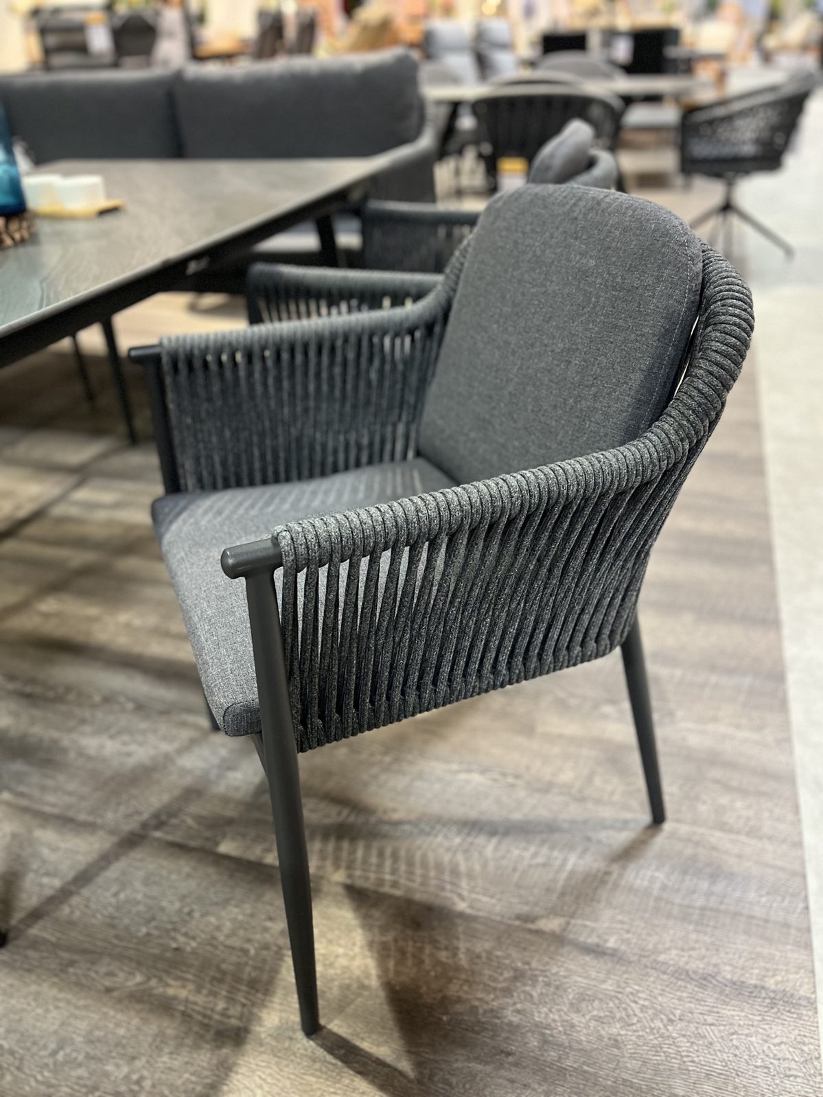 Der Armlehnstuhl Bari II der Firma Wholesaler ist in tollen Rope Material gearbeitet in der Farbe dunkelgrau. Das Gestell ein Aluminiumgestell in der Farbe anthrazit. Die Auflage ist ein Olefin dunklegrau gehalten. Dieser Stuhl ist einfach ein echter Hingucker.