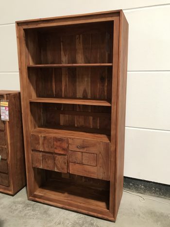 Das Regal Timber der Firma Ludwig Gutmann ist aus massivem Akazienholz gearbeitet. Die Oberfläche wurde gebeizt, sodass die elegante und vielfältige Maserung zur Geltung kommen kann.