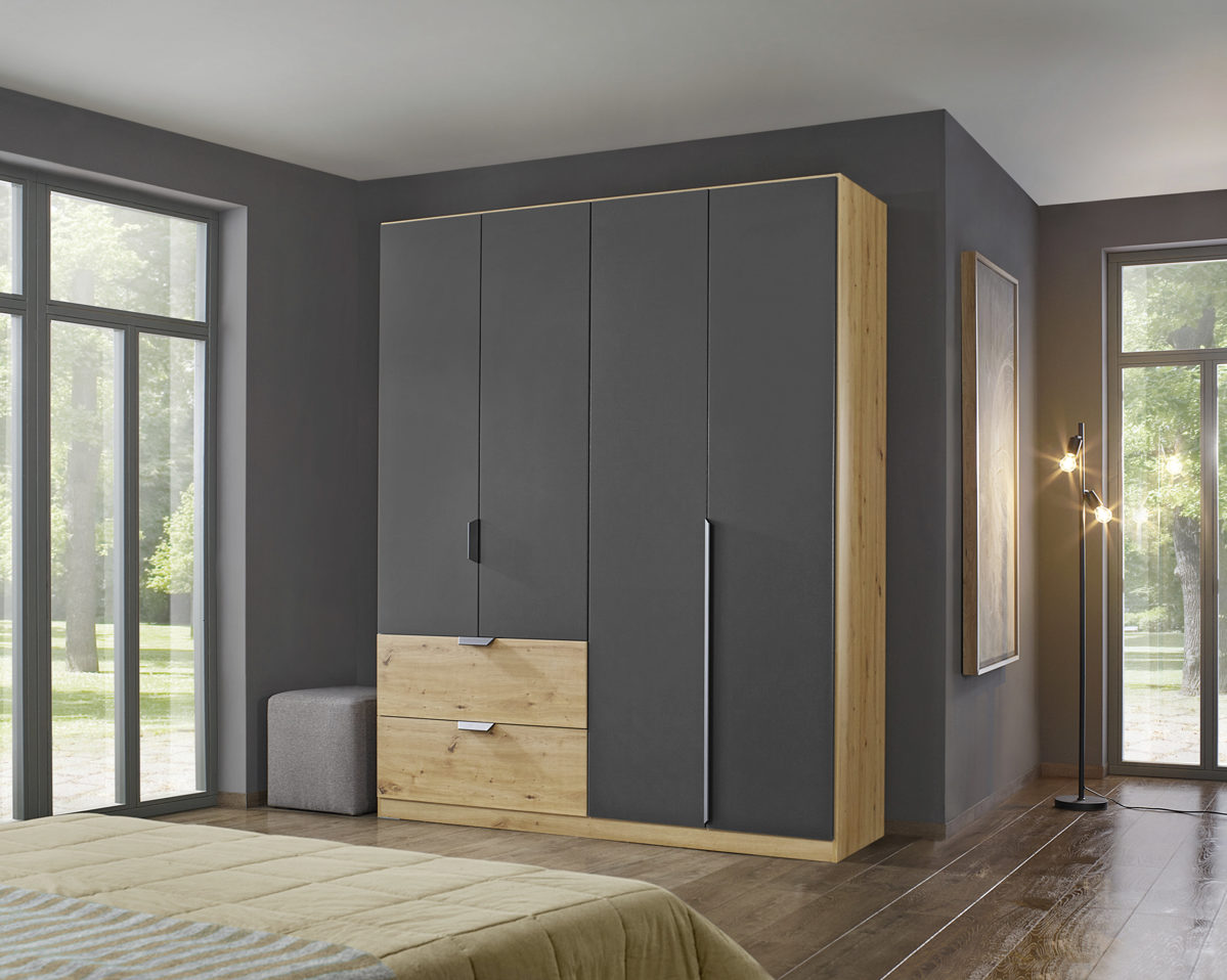Der Kleiderschrank Quadra Spin der Firma Rauch Möbel verfügt über 4 Drehtüren und 2 Schubkästen. Der Korpus und die Schubkästen sind im Farbton Eiche Artisan. Die Drehtürenfronten sind in grau metallic.