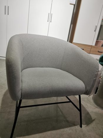 Der Stuhl Ramsey von ACTONA hat vier schwarze Metallbeine und eine Bezug in grau. Armlehnen und Rücken sind in einem runden übergang verbunden und somit eins, was den Körper angenehm einfasst.