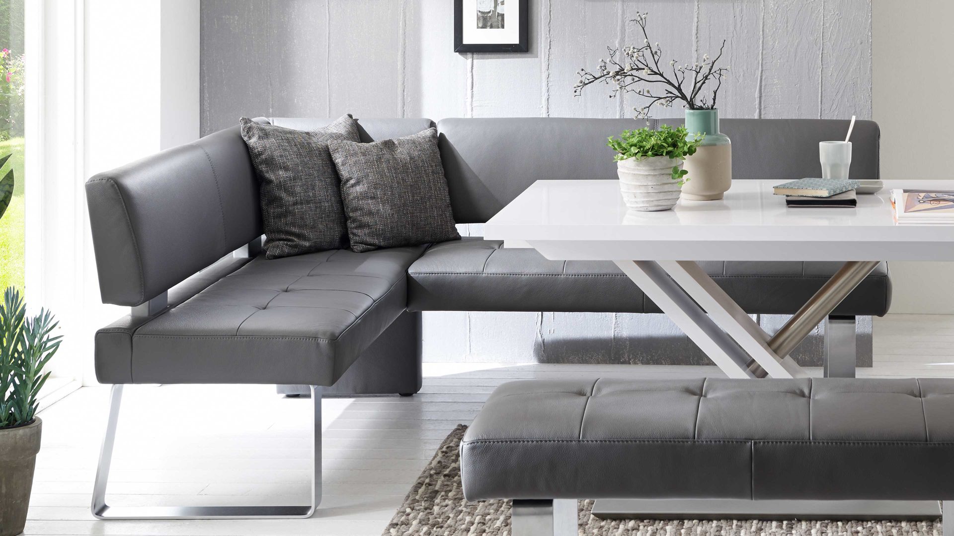 Als kompaktes Sitzmöbel leistet Ihnen die Hockerbank in der Küche oder im Esszimmer gute Dienste. Laden Sie Ihre Freunde und Familie zu einer geselligen Runde ein und genießen Sie hohen Sitzkomfort auf dieser Polsterbank, die ein echter Blickfang ist. Der Longlife-Dicklederbezug in Grau ist elegant und robust.