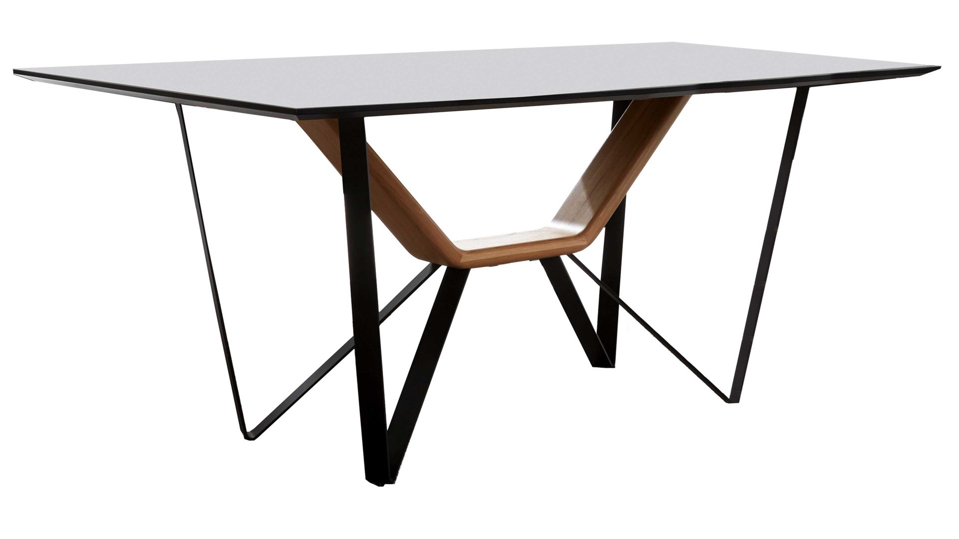 Als Basis fungieren ein mattschwarz pulverbeschichtetes Flachkufengestell mit Struktur sowie ein UV-beschichteter Wildeichen-Massivholzbügel mit Öl-Effekt, der für eine natürlich-warme Note sorgt. Die anthrazitfarbene Keramiktischplatte begeistert visuell und ist zudem widerstandsfähig und belastbar, lichtbeständig, hygienisch und pflegeleicht.