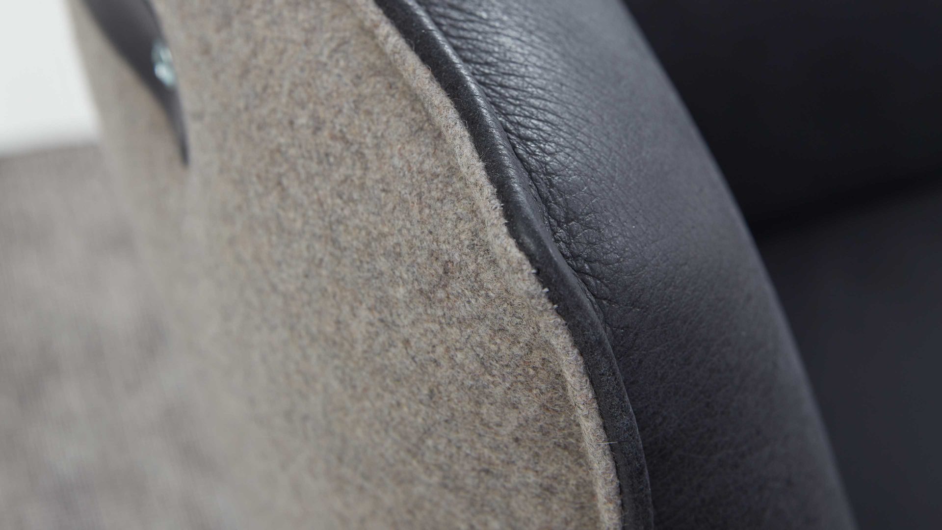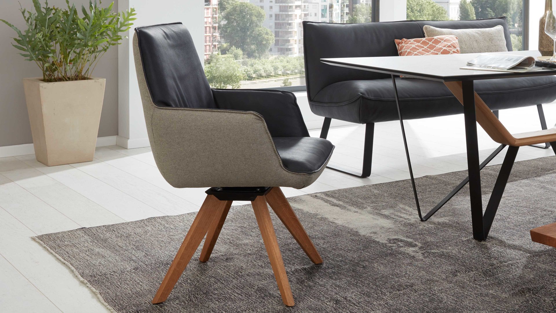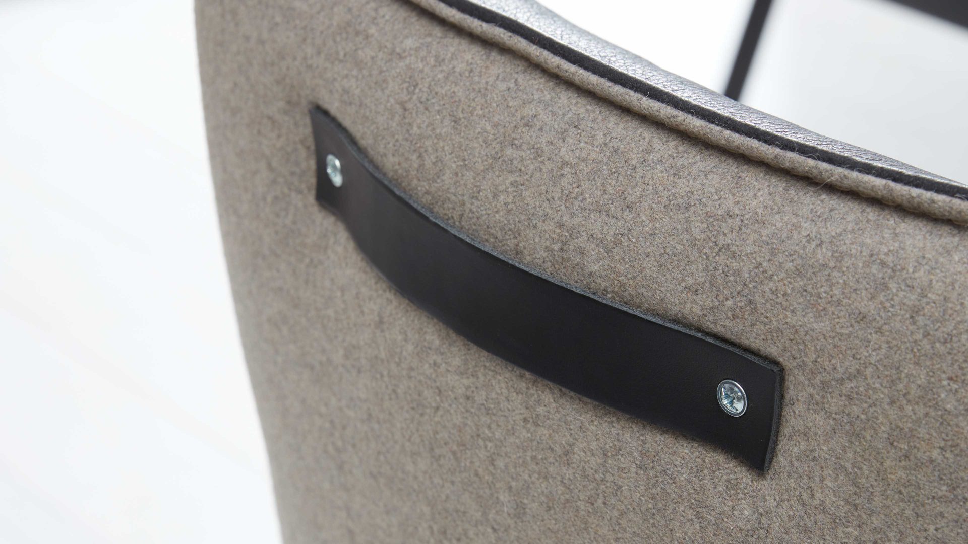 Als Basis fungieren UV-beschichtete Wildeichenfüße mit Öl-Effekt, die für eine natürlich-warme Note sorgen, und ein mattschwarz pulverbeschichtetes Untergestell. Die Sitzeinheit des außergewöhnlichen Stuhls ist innen mit dunklem Leder bezogen - außen weist sie einen Lodenbezug auf.