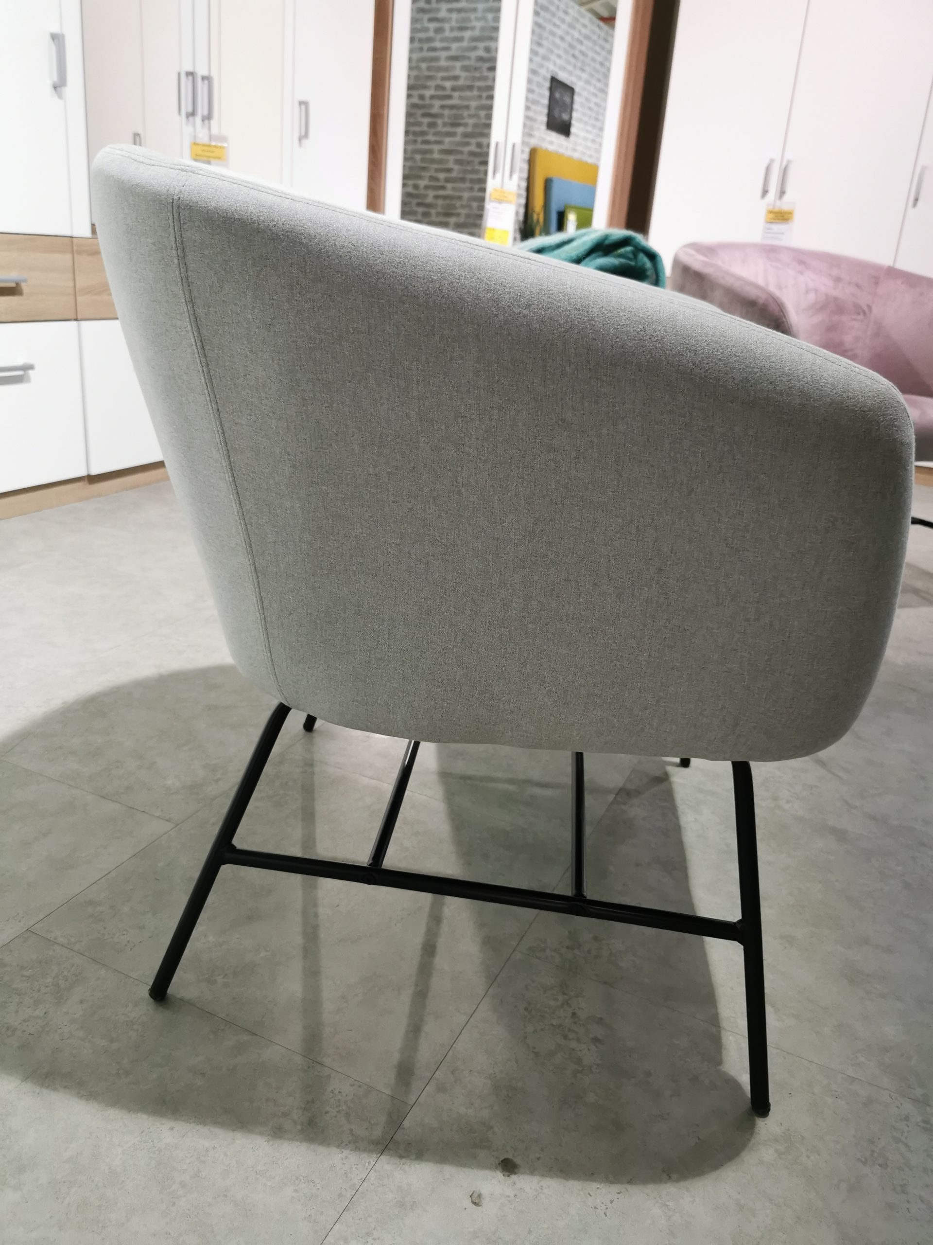 Der Stuhl Ramsey von ACTONA hat vier schwarze Metallbeine und eine Bezug in grau. Armlehnen und Rücken sind in einem runden übergang verbunden und somit eins, was den Körper angenehm einfasst.