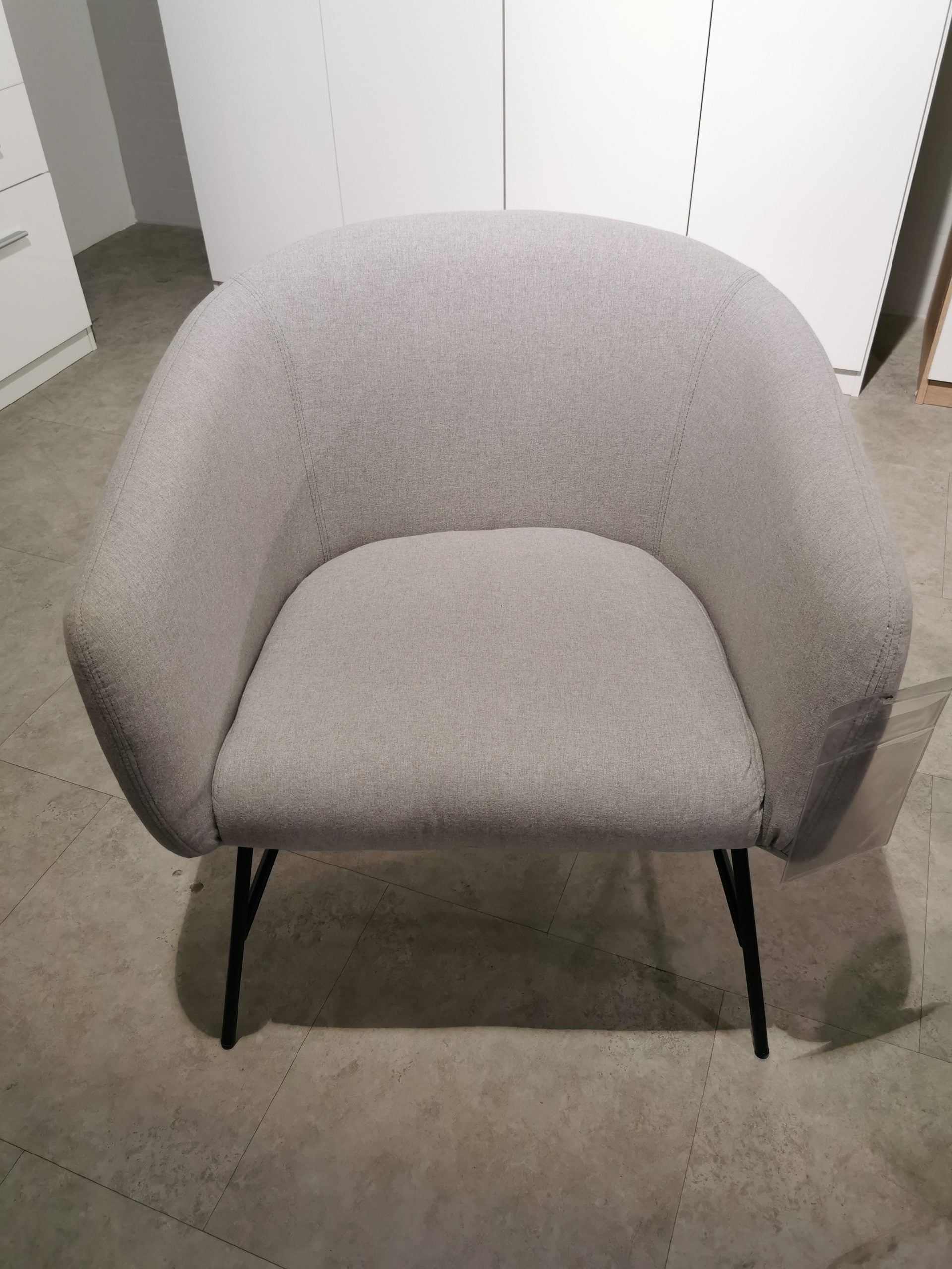 Der Stuhl Ramsey von ACTONA hat vier schwarze Metallbeine und eine Bezug in grau. Armlehnen und Rücken sind in einem runden übergang verbunden und somit eins, was den Körper angenehm einfasst.