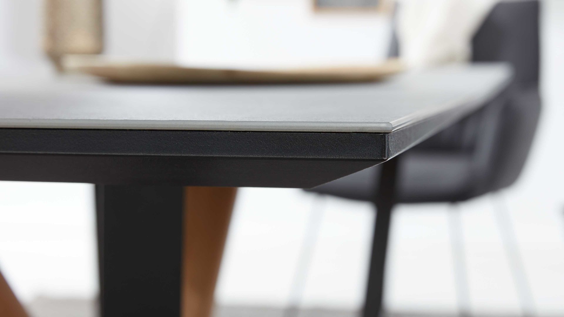 Als Basis fungieren ein mattschwarz pulverbeschichtetes Flachkufengestell mit Struktur sowie ein UV-beschichteter Wildeichen-Massivholzbügel mit Öl-Effekt, der für eine natürlich-warme Note sorgt. Die anthrazitfarbene Keramiktischplatte begeistert visuell und ist zudem widerstandsfähig und belastbar, lichtbeständig, hygienisch und pflegeleicht.