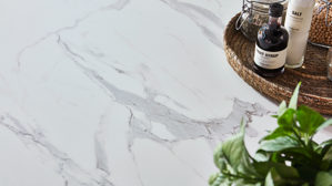 Arbeitsplatten und Ansetztisch in weißer Venato Bianco Marmor-Nachbildung setzen einen eleganten Kontrast und verleihen der Küche eine helle, stilvolle Ausstrahlung. So entsteht ein harmonisches Gesamtbild mit klarer Linienführung und feinem Materialspiel.