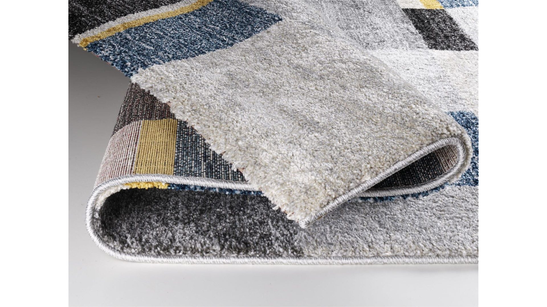 Moderne Mosaikstruktur in angenehm-dezenten Farbverläufen: Die geometrisch angeordneten Vierecke verschiedener Größe und Kolorierung dieses Wohnaccessoires sorgen für Form- und Farbenvielfalt, gleichmäßige Struktur und erzeugen ein harmonisches Karreefeld des Designerteppichs Castle Beppo. Der Webteppich ist seitlich gekettelt und vor Kopf umgeschlagen.