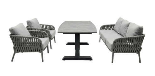 Das Dining 3er Sofa Terrano der Firma Wholesaler ist aus einem Ropegeflecht in dunkelgrau und einem Gestell aus Aluminum gehalten.