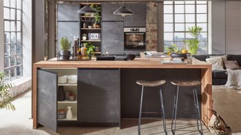 Die nobilia® Einbauküche Laser begeistert mit ihrem wilden Industrie-Look, der exzellenten Verarbeitung und der hohen Funktionalität. Sie kombiniert schwarzbetonfarbene Fronten mit Taxus-Nachbildung. Der Korpus und die Sockelblenden sind ebenfalls im speziellen Schwarzbetonton gestaltet, während die Arbeitsplatten und Sichtseiten die warme Taxusnuance aufgreifen. Akzentuierend wirkt die grifflose Frontgestaltung.
