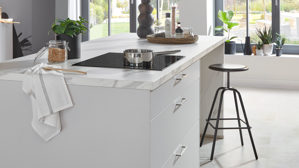 Arbeitsplatten und Ansetztisch in weißer Venato Bianco Marmor-Nachbildung setzen einen eleganten Kontrast und verleihen der Küche eine helle, stilvolle Ausstrahlung. So entsteht ein harmonisches Gesamtbild mit klarer Linienführung und feinem Materialspiel.