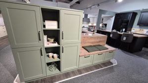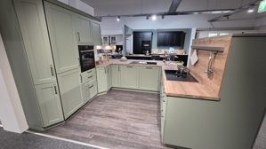 Die Küche Vienna von Wert Küche ist in Salbeigrün gehalten. Ein Highlight ist der Backofen und die Sitzgelegenheit auf der anderen Seite.