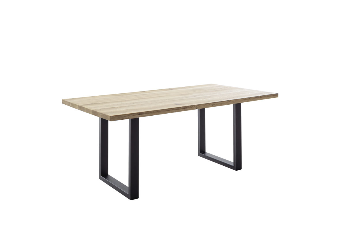 Der Esstisch Deba der Firma MCA direkt ist im Holz Eiche geölt gehalten. Die Tischplatte besteht aus durchgehenden Lamellen. Das Gestell ist ein Metallgestell in U-Form.