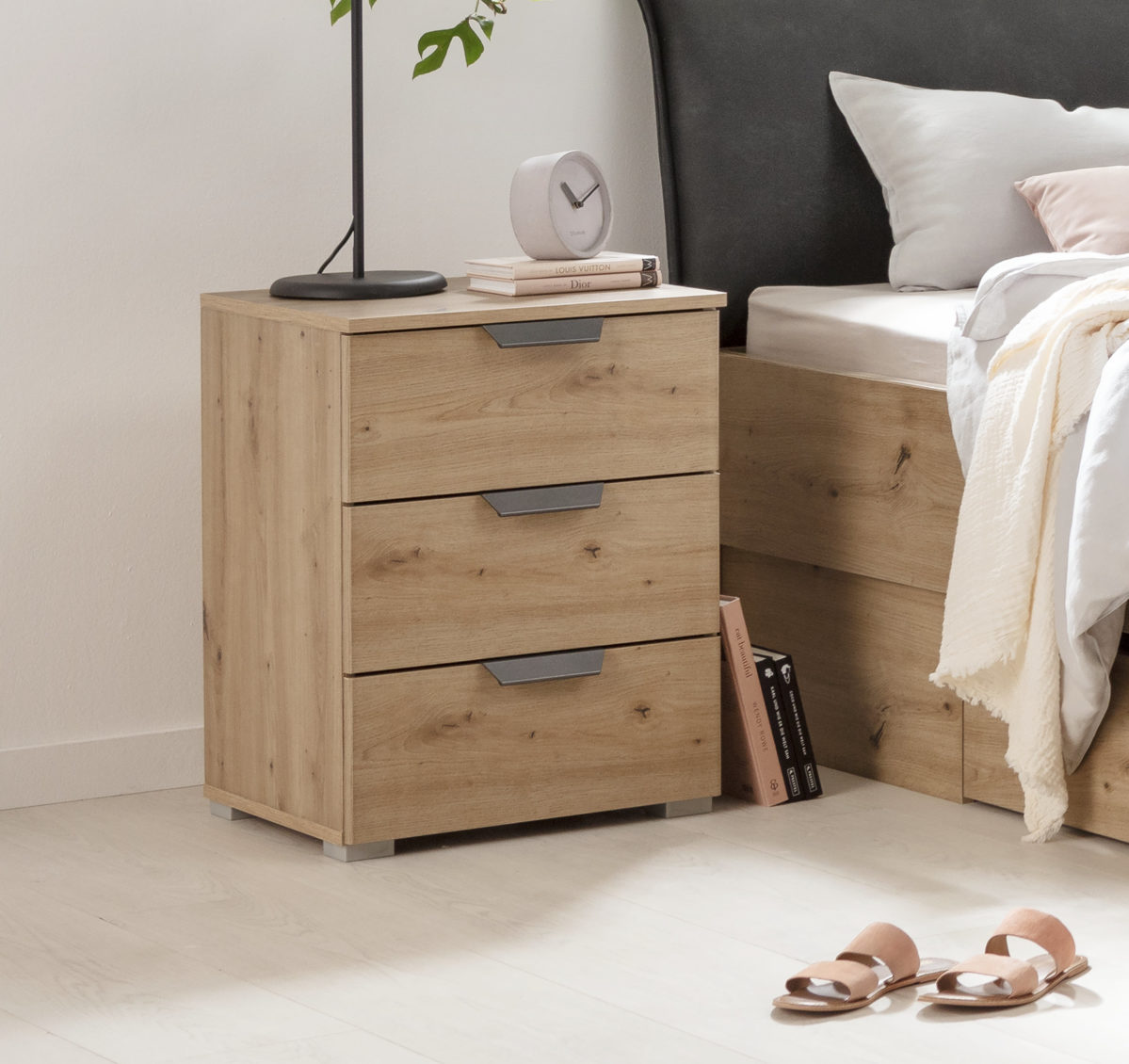 Die Nachtkommode Aditio der Firma Rauch Möbel ist im Korpus Eiche Artisan mit Griffen in grau metallic. Sie verfügt über 3 Schubkästen.