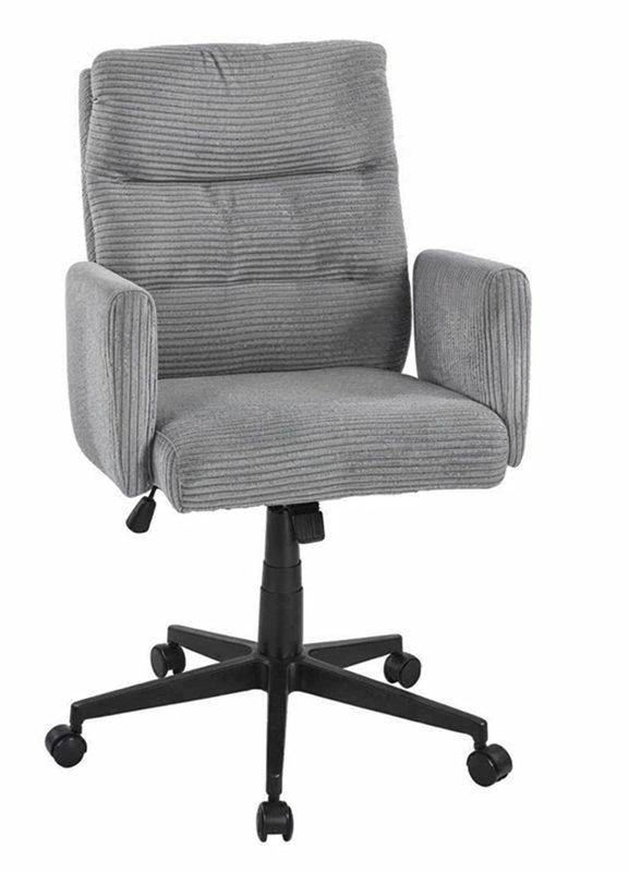 Der Chefsessel Charly der Firma Duo Collection ist in schönem Cord in grau. Das Gestell ist ein Metallgestell in schwarz. Er hat gebremste Sicherheitsdoppelrollen, sowie eine Härtegradeinstellung. Er ist belastbar bis 100kg.