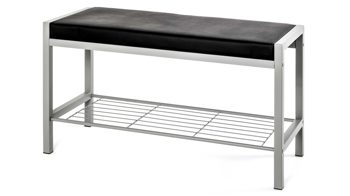 Diese moderne Garderobenbank wird garantiert zu einem Blickfang im Flur oder dem Eingangsbereich Ihres Zuhauses. Gefertigt wurde das praktische Dielenmöbel aus alufarbenem Stahlrohr sowie pflegeleichtem Stahldraht. Ein schwarzer Kunstlederbezug verleiht dem Kleinmöbel einen edlen Touch. Die multifunktionale Sitzbank begeistert nicht nur mit ihrer weich gepolsterten Sitzfläche, sondern auch mit ihren kompakten Maßen von nur ca. 80 x 48 x 32 cm (BxHxT).