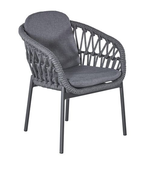 Der Armlehnstuhl Bari der Firma Wholesaler ist in tollen Rope Material gearbeitet in der Farbe dunkelgrau. Das Gestell ein Aluminiumgestell in der Farbe anthrazit. Die Auflage ist ein Olefin dunklegrau gehalten. Dieser Stuhl ist einfach ein echter Hingucker.
