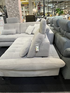 Die Wohnlandschaft MM-MP 1143 der Firma Megapol ist in Stoff Belle silver gehalten. Sie verfügt über eine Sitztiefenverstellung an jedem Sitzplatz des 2,5-Sitzers. Zudem befindet sich im 2,5-Sitzer eine Schlaffunktion.