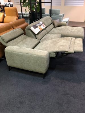 Die Wohnlandschaft Fenja der Firma Carina ist in einem dezenten grün gehalten. Sie besitzt zwei besondere Funktionen. Man kann die Rückelement hochklappen, um eine Unterstützung für Kopf und Nacken zu haben. Im äußeren linken Sitz befindet sich eine elektrische Relaxfunktion, die eine Verstellung bis in Herzwaage Position ermöglicht.
