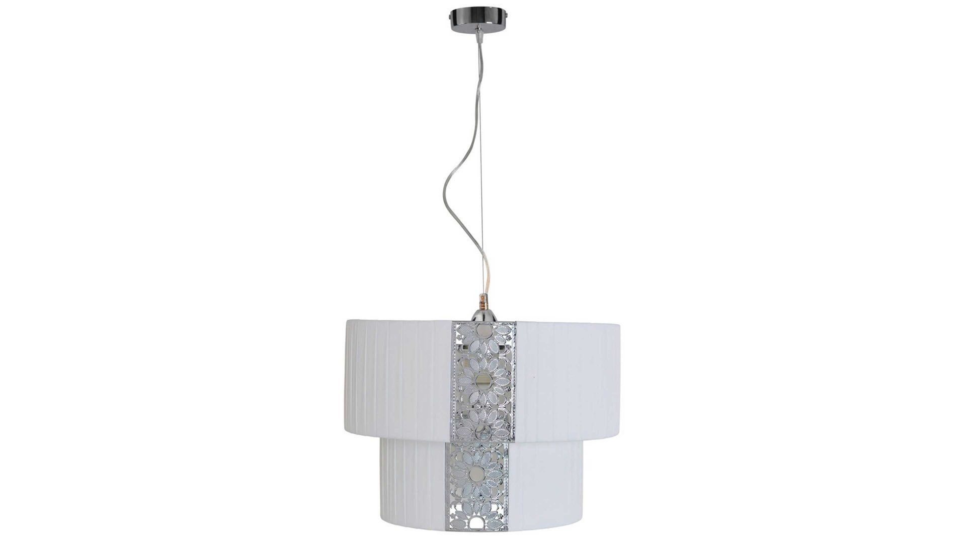Sie überzeugt mit ihrem gefalteten weißen Stoff-Lampenschirm, dessen edle florale Applikationen im attraktiven Farbton Silber ganz klar die optischen Highlights bilden.