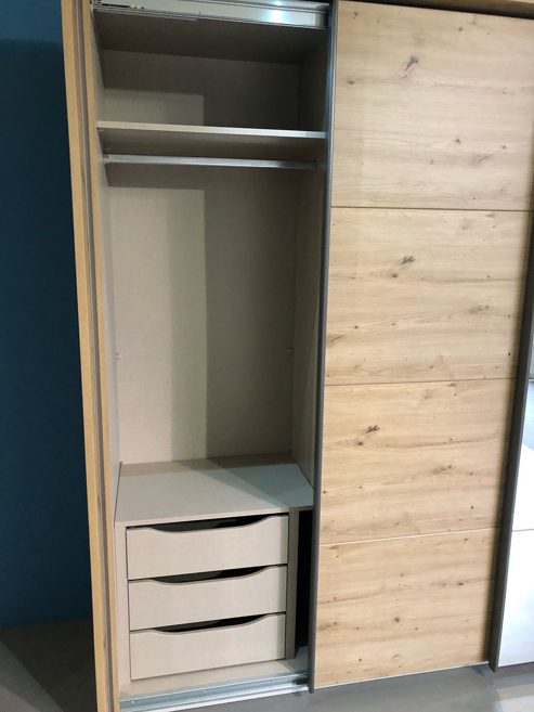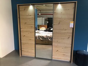 Der Schwebetürenschrank Kulmbach-G ist nur 200cm Breit, dennoch verfügt er über eine Menge Stauraum, insbesondere durch den Schubkasteneinsatz. Die Front ist in einem warmen Eicheton gehalten und besitzt einen großen Spiegel.