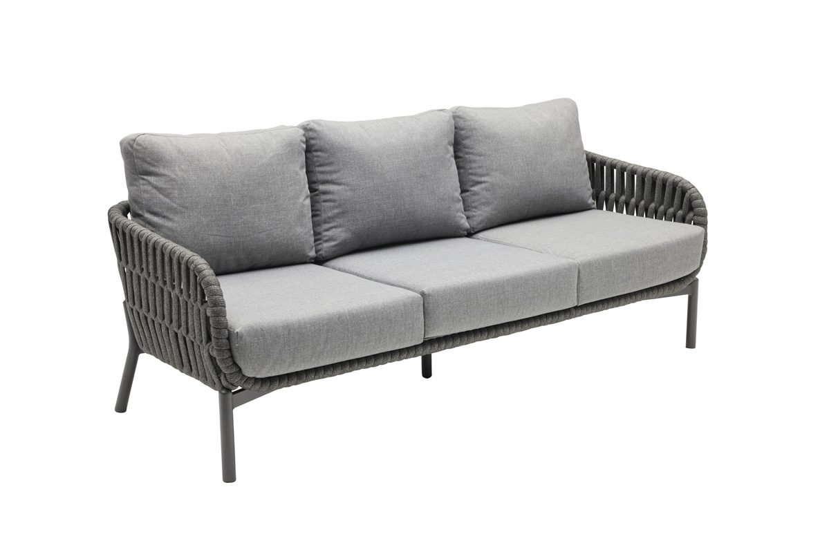 Das Dining 3er Sofa Terrano der Firma Wholesaler ist aus einem Ropegeflecht in dunkelgrau und einem Gestell aus Aluminum gehalten.