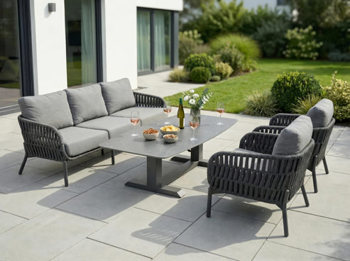 Die Kissen aus Olefin in dunkelgrau sind ebenfalls inklusive.