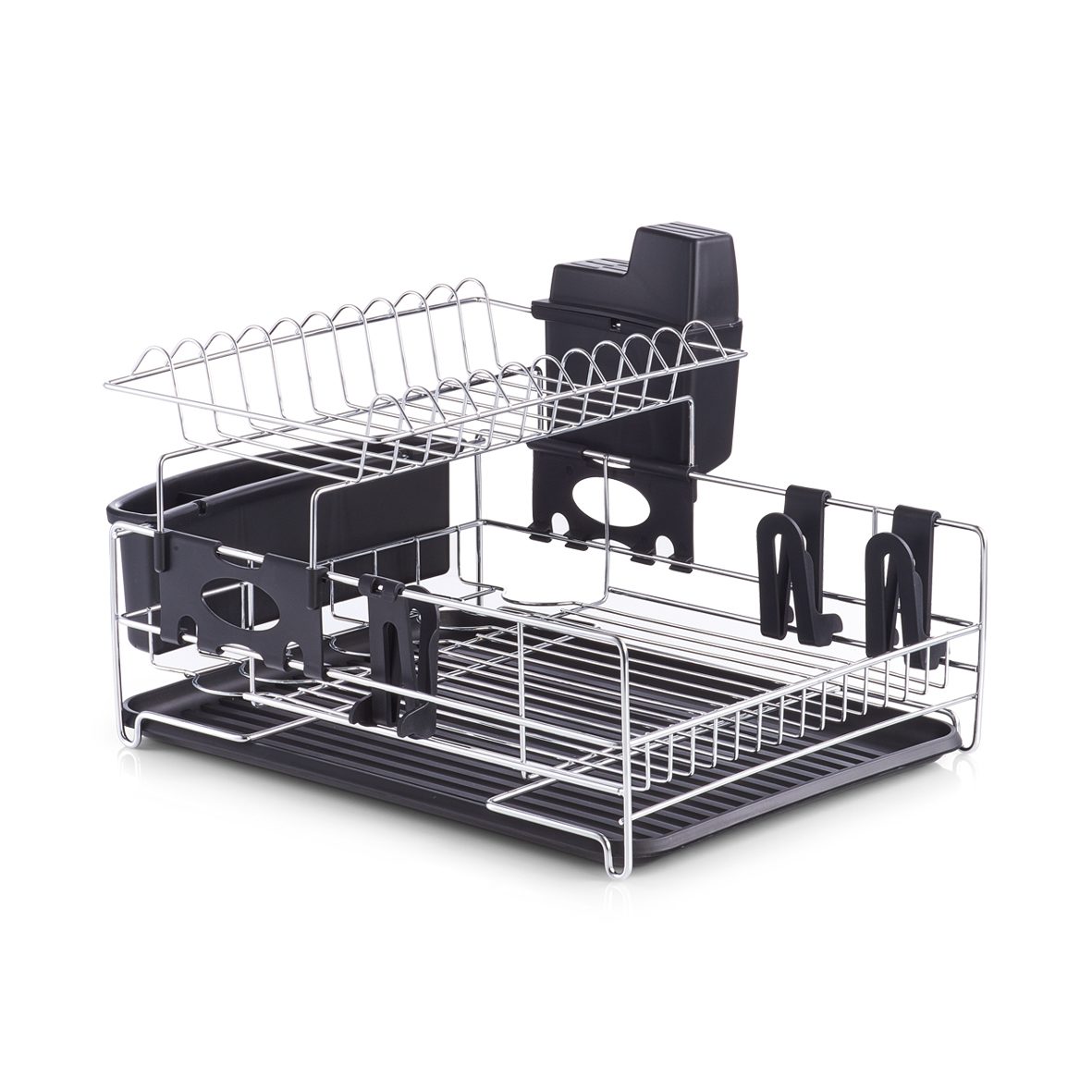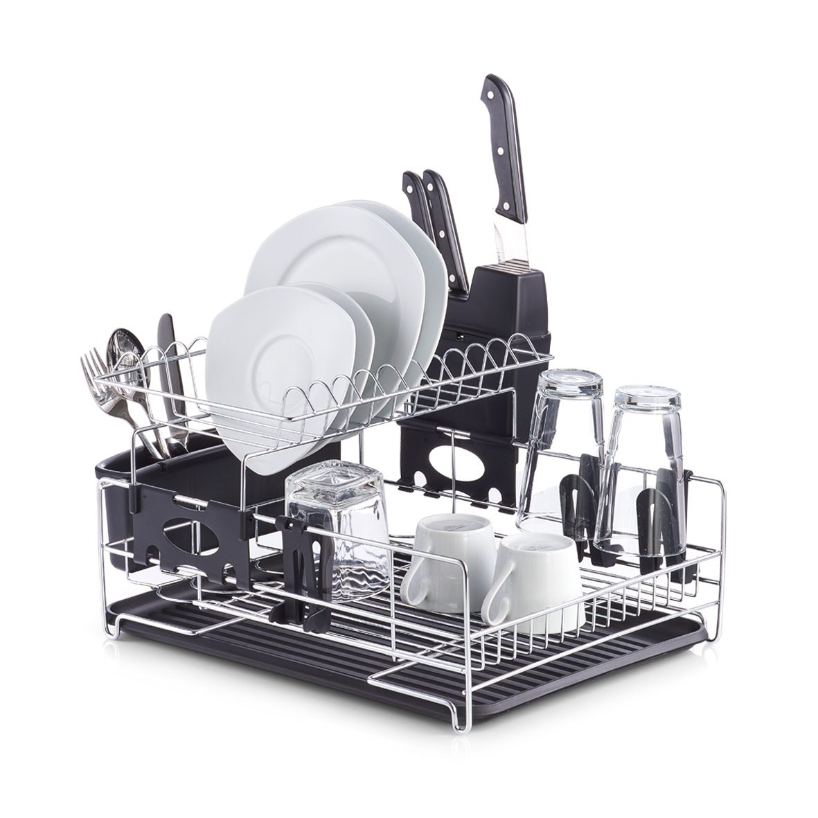 Der Abtropfständer ist aus langlebigem schwarzem Kunststoff gefertigt und wird durch zeitloses verchromtes Metall ergänzt. Erleben Sie die durchdachten Funktionen des Geschirrständers, denn neben dem platzsparenden 2-Ebenen-Design weist der Geschirrständer zahlreiche multifunktionale Eigenschaften auf. Der Küchenhelfer erleichtert Ihren Alltag durch einen entnehmbaren Abtropfbehälter für neun Messer, Abtropfkorb für Besteck mit drei Fächern sowie seitliche Halterungen zur Trocknung von drei Gläsern: Außerdem weist der robuste Kunststoff zusätzliche Rillen auf. Sie erhalten den Geschirrabtropfständer mit den Maßen von ca. 44 x 29 x 40 cm (BxHxT), sodass er in viele Küchen passt und jede Arbeitsfläche unkompliziert bereichert.