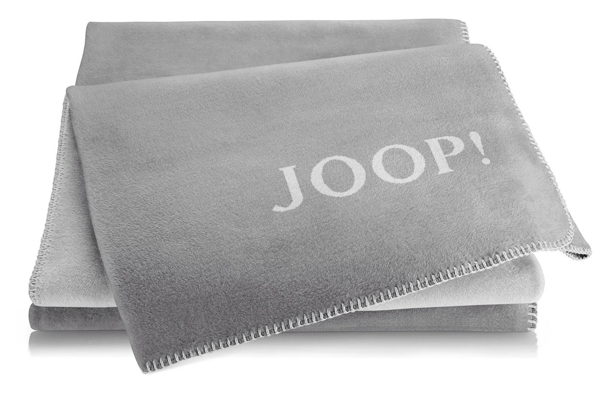 Die Wohndecke UDF der Firma JOOP ist mit einer Logo-Stickerei in Kontrastfarbe versehen. Sie besteht aus 58% Baumwolle,35% Polyacryl und 7% Polyester