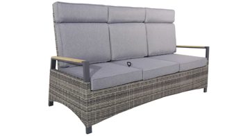 Das 3-Sitzer Sofa Keramo der Firma Wholesaler kann sowohl als Lounge-Sofa, als auch als Speisesofa genutzt werden. So haben Sie ein 2 in 1 Produkt! Die Rückenlehne lässt sich ganz einfach auf Knopdruck stufenlos nach hinten verstellen. Ein richtiges Higlight sind die Teak-Armlehnen.