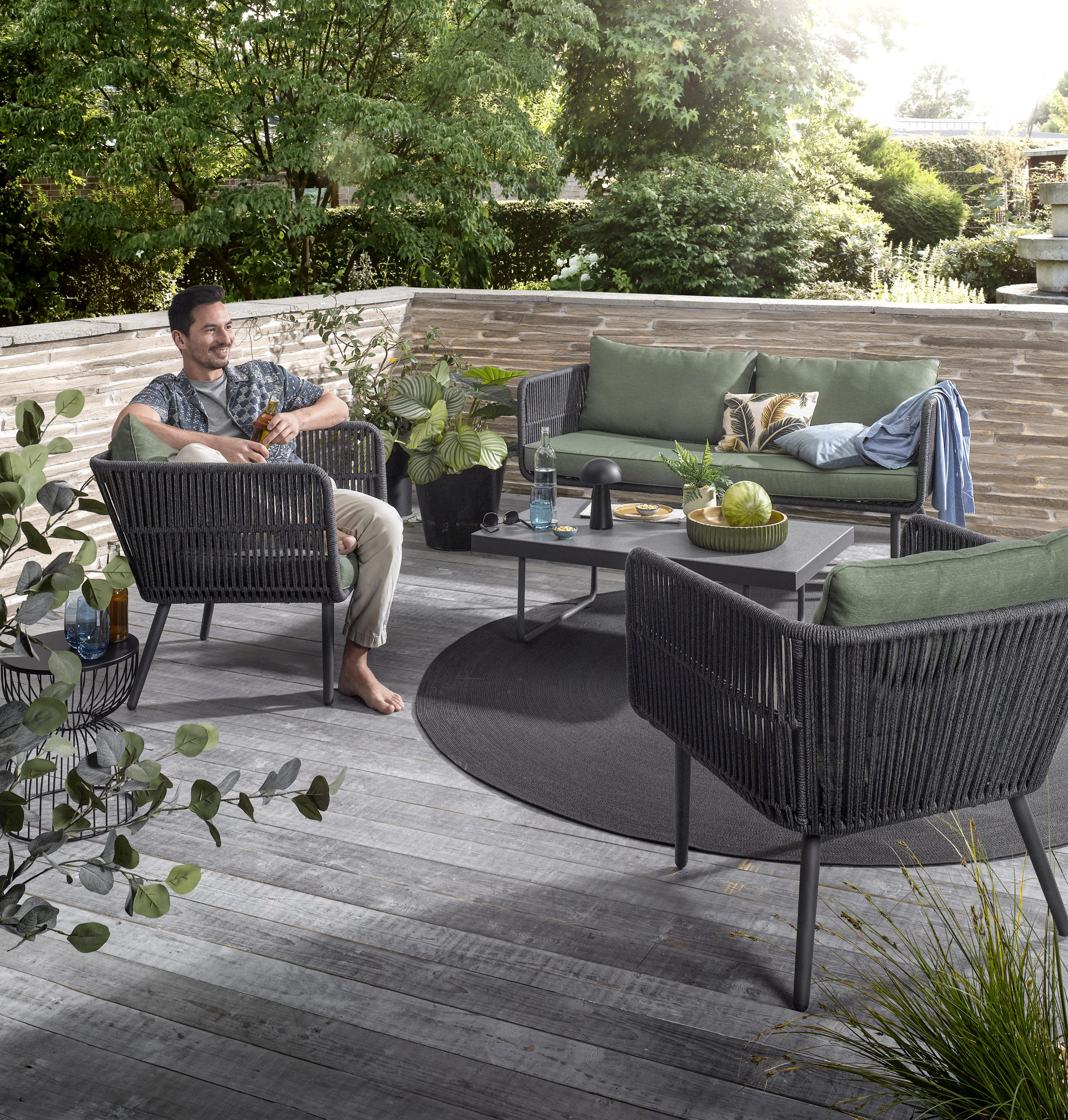 Das Loungeset Saigon 249715 der Firma Wholesaler besteht 2 Sesseln, einem Sofa, sowie einem Couchtisch. Ein Highlight ist das Rope-Geflecht mit den Auflagen in hellgrau.