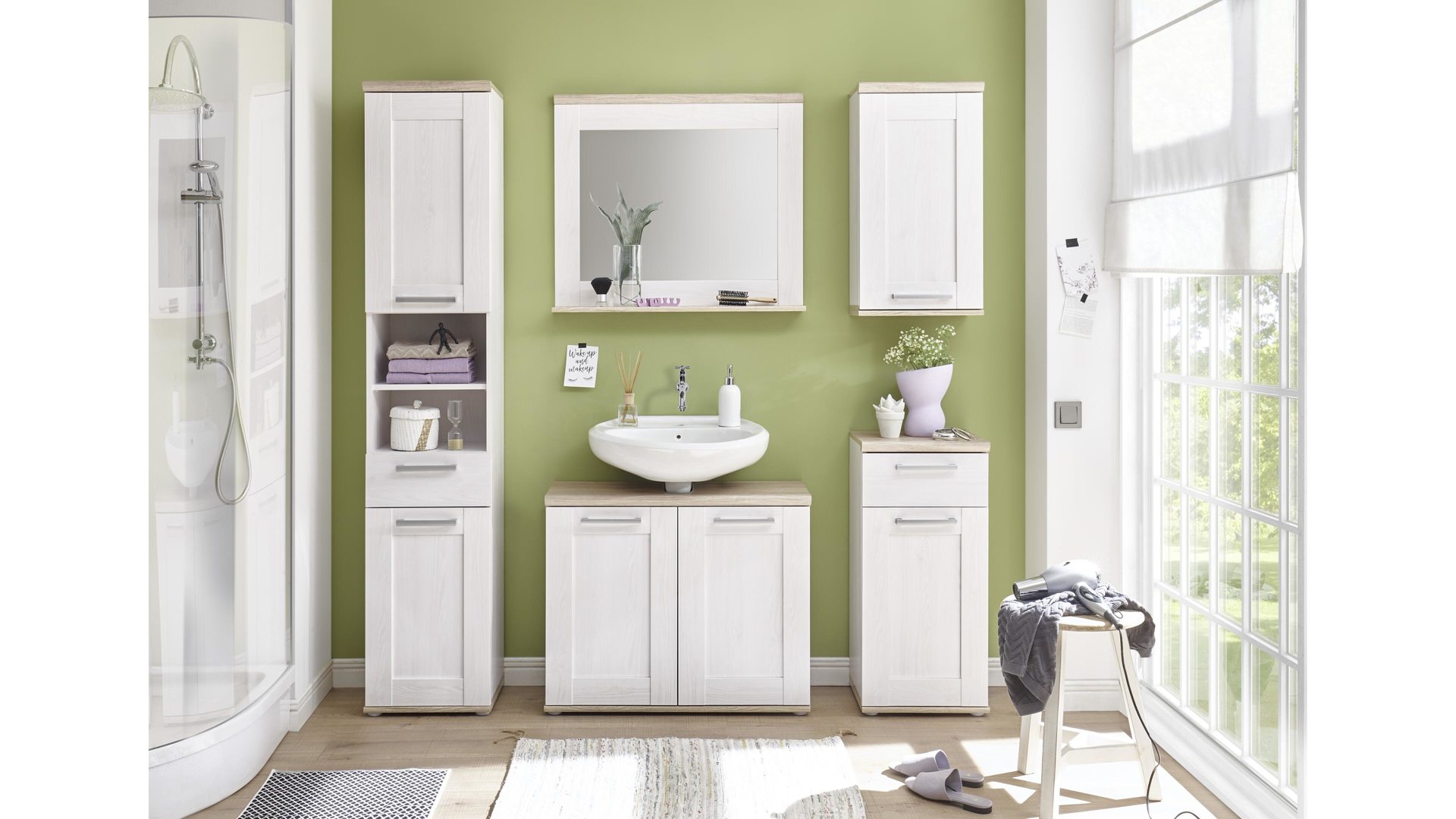 Auch der Waschbeckenunterschrank ist zweitürig aufgebaut. Im Inneren befindet sich ein Boden, der den Schrank in zwei Bereiche unterteilt. Die Maße belaufen sich auf ca. 80 x 65 x 33 cm (BxHxT). Für ein harmonisches Gesamtbild positionieren Sie den ca. 80 x 70 x 20 cm (BxHxT) großen Wandspiegel mit praktischem Ablageboden über dem Waschbeckenunterschrank.