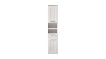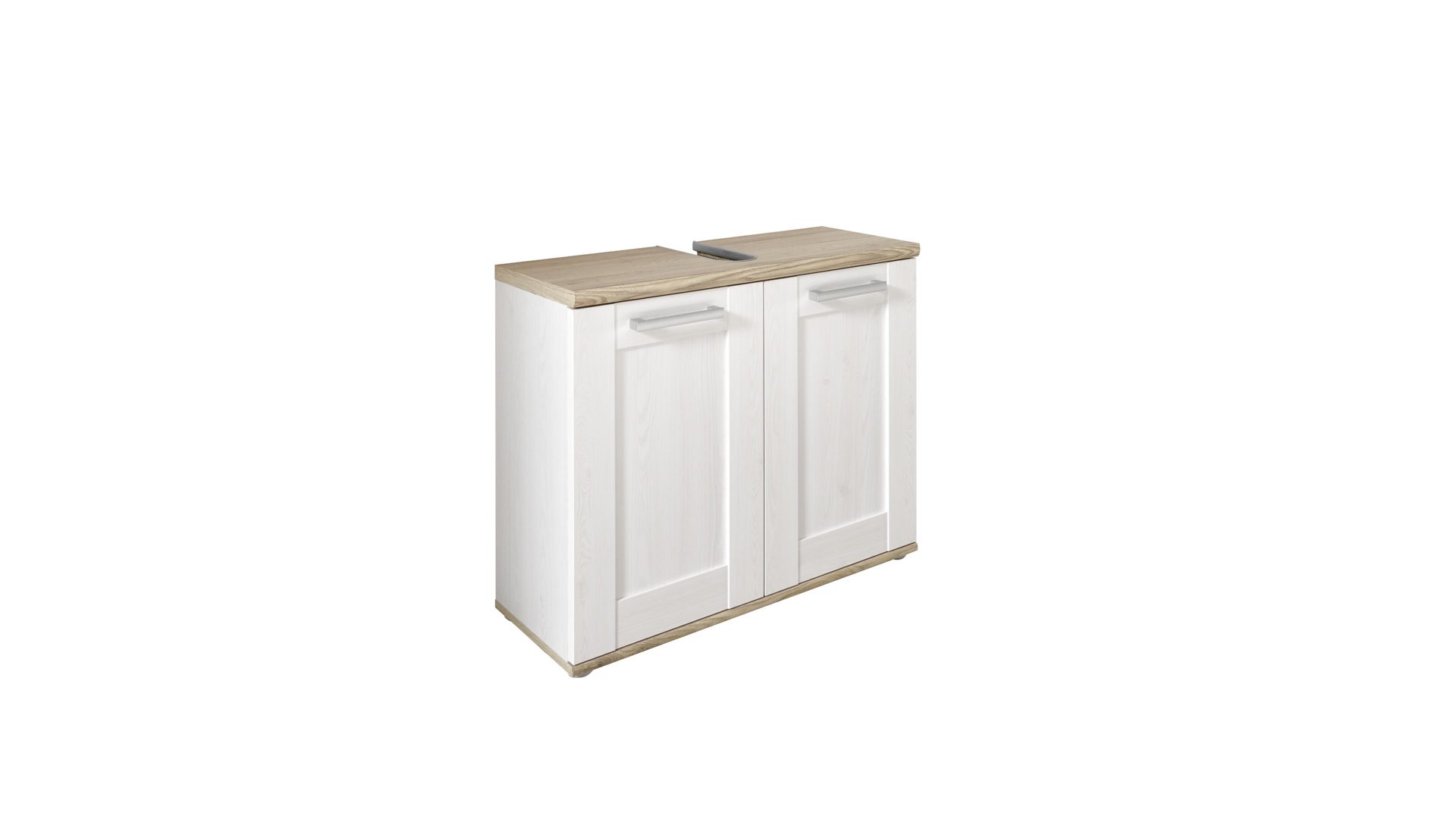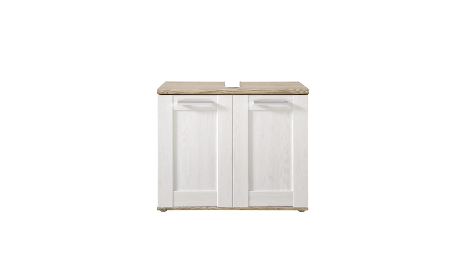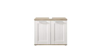 Beim zweitürigen Waschbeckenunterschrank Romance verbinden sich die Sibiu Lärche-Nachbildung und die hellen San-Remo-Kunststoffoberflächen zu einem ansprechenden Ganzen. Die stilvoll kombinierten Design-Merkmale verleihen dem Badmöbel eine edle Ausstrahlung.