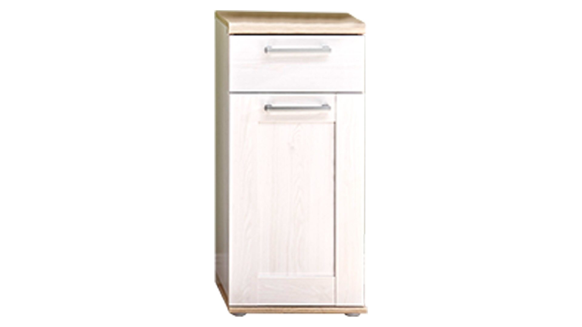 Hinter der Tür befindet sich ein Boden. Dieser unterteilt den Unterschrank in zwei Bereiche, die Sie mit verschiedenen Badutensilien füllen können. Zudem weist der Badschrank oben eine Schublade auf. Die Maße belaufen sich auf ca. 39 x 82 x 33 cm (BxHxT).