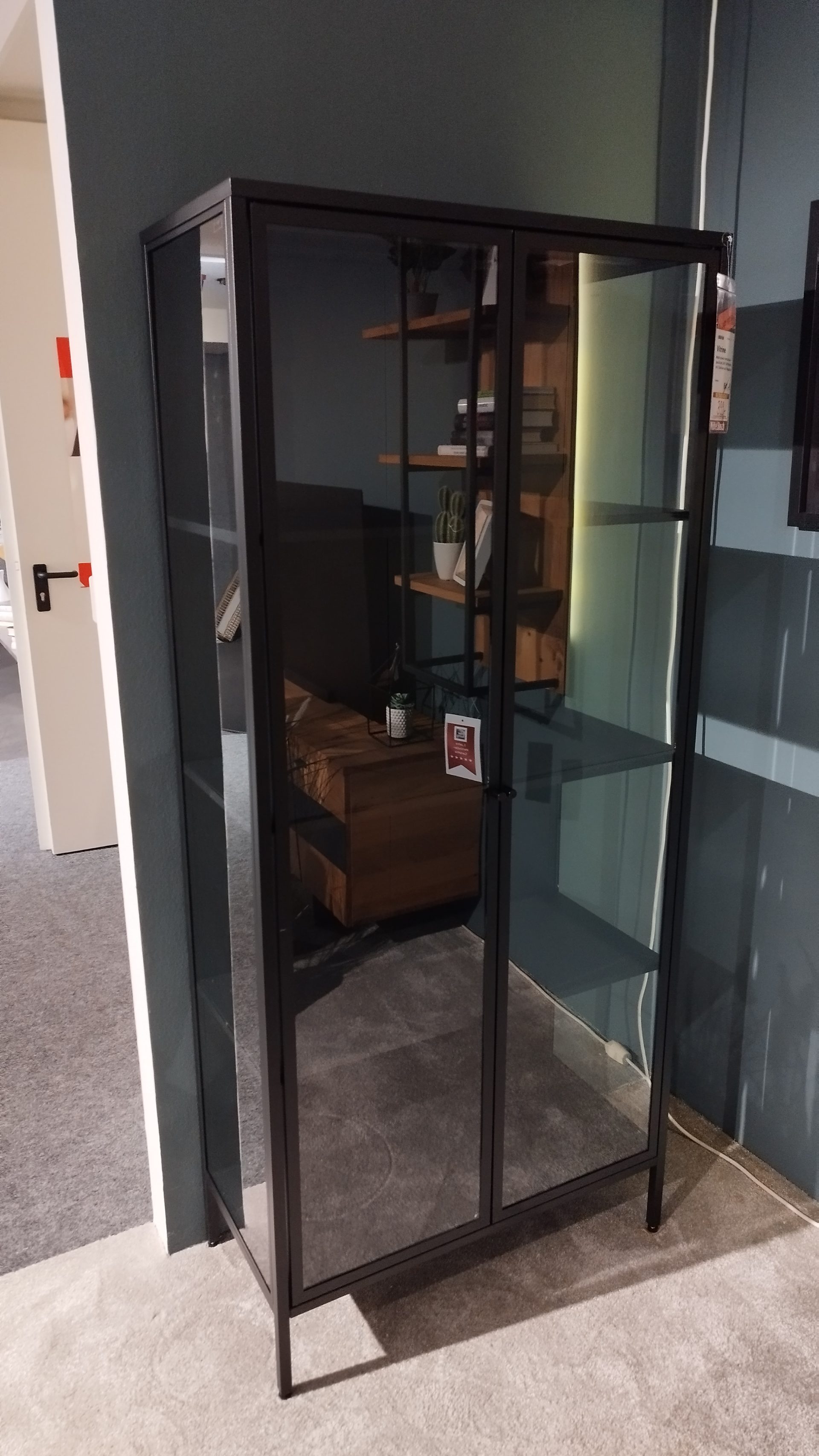 Metall schwarz matt rau pulverbeschichtet, BxHxT: 80x180x40cm mit 2 Glastüren und 3 Regalböden